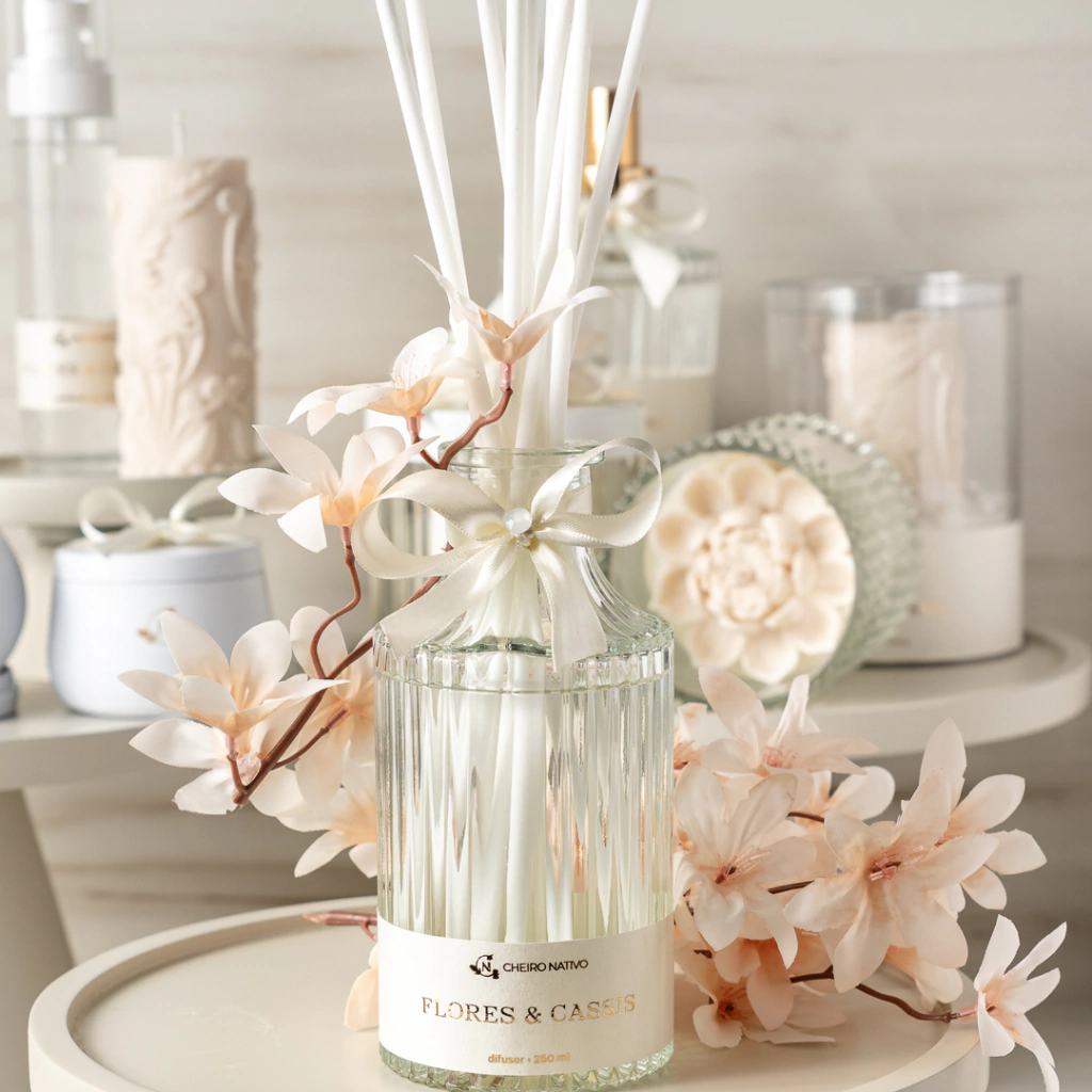 Flores & Cassis é uma fragrância que traduz frescor e brilho. Logo na saída, a vivacidade da laranja, do cassis e da bergamota cria uma sensação radiante e envolvente, como um sopro de alegria que ilumina o ambiente.