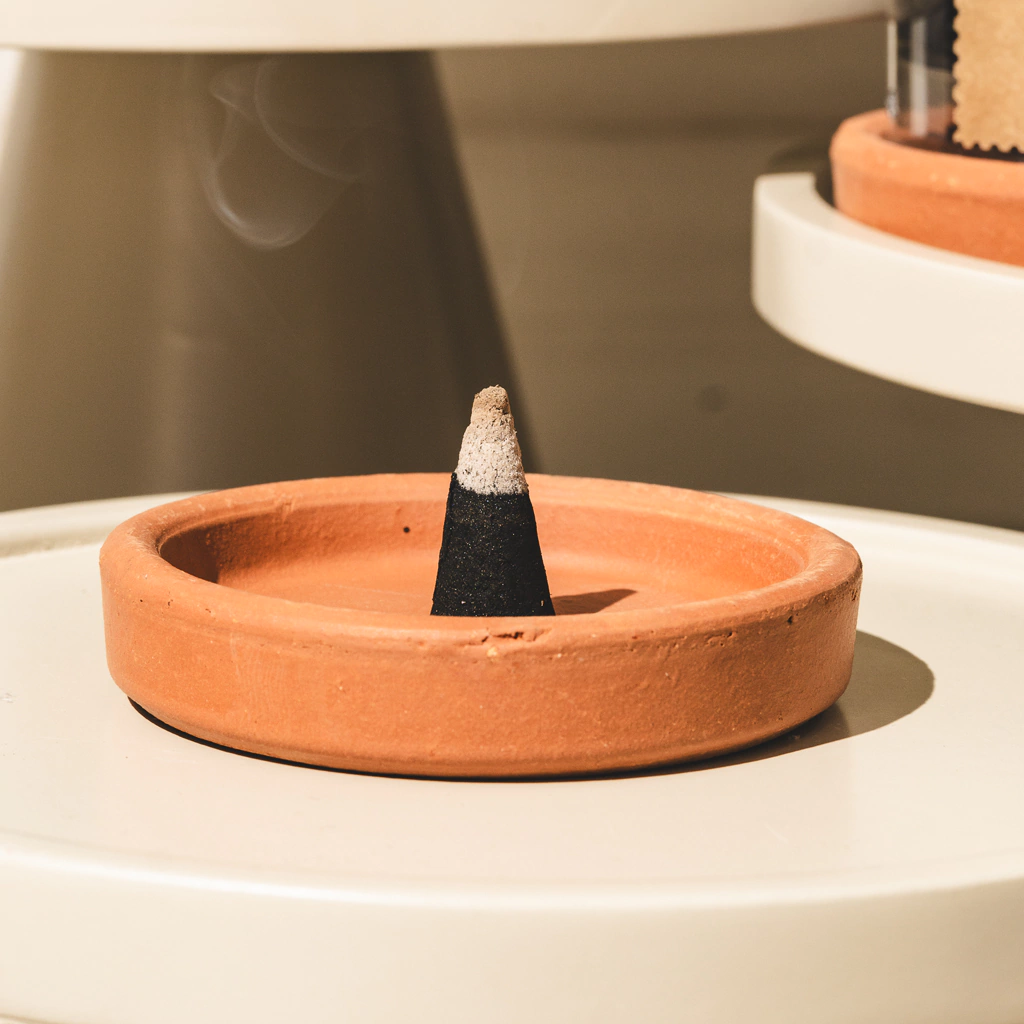 Este produto contém: 1 embalagem com 25g de incenso cone (entre 20 e 25 unidades) e 1 prato de cerâmica.