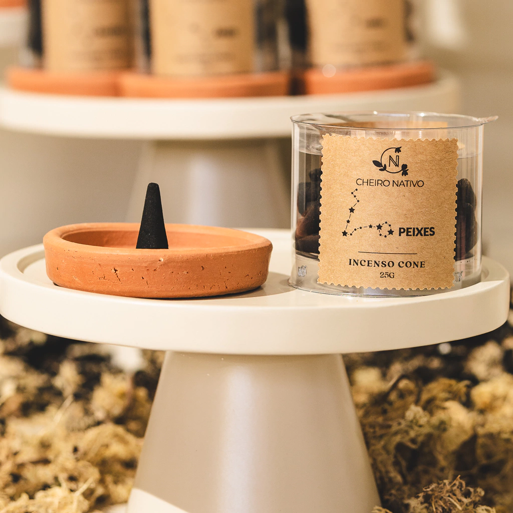 Este produto contém: 1 embalagem com 25g de incenso cone (entre 20 e 25 unidades) e 1 prato de cerâmica.
