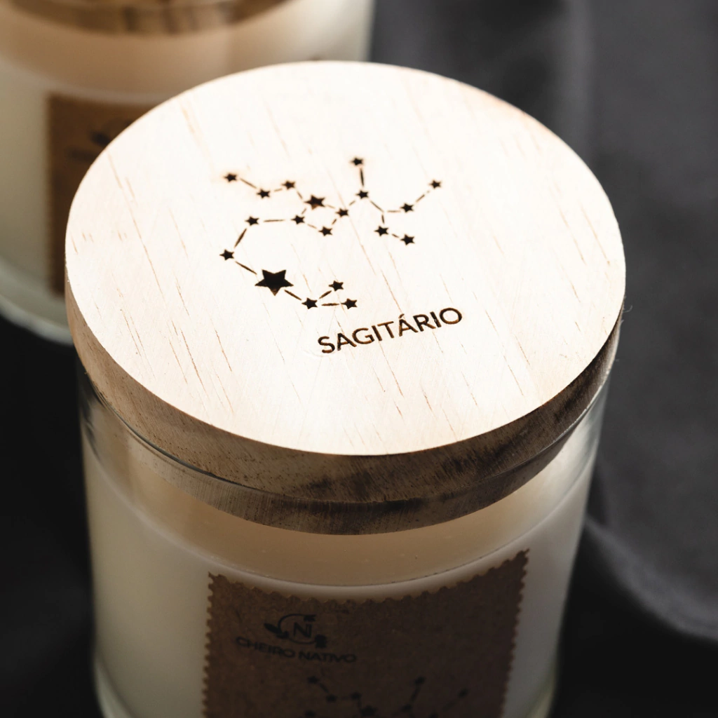 Esse produto contém: 1 vela de 180g e 1 tampa de madeira pinus com a constelação do signo de Sagitário.